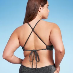 Black lurex bralette bikini top from Wild Fable™ with a halter-style high neckline. Made of soft fabric with a blend of metallic fiber and spandex. Slender shoulder straps make a crisscross design at the back and fasten for an adjustable fit.