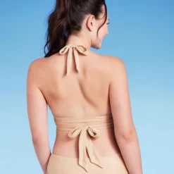 Gold bralette bikini top from Wild Fable™ tailored in a longline silhouette with a wrap front. Made of stretchy fabric with full lining and comes with removable cups. Back tie and halter straps complete the look with a custom fit.