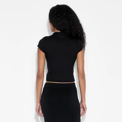 Ribbed T-shirt from Wild Fable™ in a solid shade with a mock turtleneck and short sleeves. Tailored in a slim-fit silhouette with a mid-length hemline. Made from midweight rayon fabric with spandex for comfortable wear that moves with you. Pullover style complete the look with easy on and off.